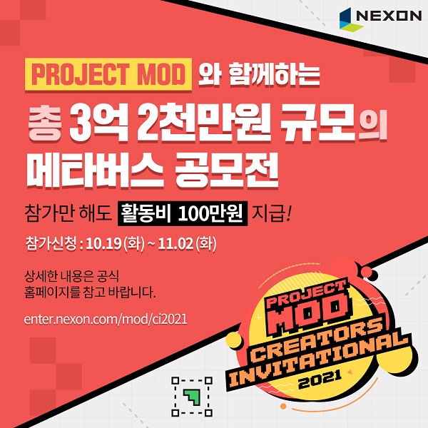 넥슨(대표 이정헌)은 자사가 개발 중인 신작 플랫폼 ‘프로젝트 MOD’ 콘텐츠 제작 공모전 ‘Creators Invitational 2021(CI 2021)’의 참가자 모집을 19일부터 시작했다.