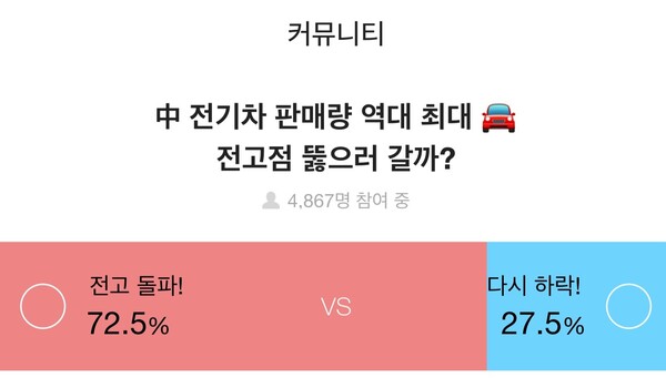 설문은 4867명이 참여했다. ‘中 전기차 판매량 역대 최대… 테슬라, 전고점 뚫으러 갈까?’ 설문에서 72.5%는 테슬라의 주가가 ‘전고점을 돌파할 것‘이라고 했다. 27.5%는 ‘다시 하락할 것’이라고 답했다.