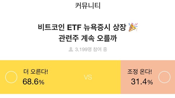 3199명이 참여한 ‘비트코인 ETF 뉴욕증시 상장… 관련주 계속 오를까’설문에서 68.6%는 우리기술투자의 주가가 ‘더 오를 것‘이라고 답했다. 31.4%는 ‘조정이 올 것’이라고 응답했다.