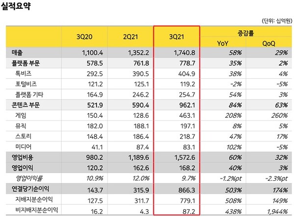 카카오(공동대표 여민수, 조수용)가 2021년 3분기 매출이 전 분기 대비 29%, 전년 동기 대비 58% 늘어난 1조7,408억 원을 기록했다고 4일 밝혔다.