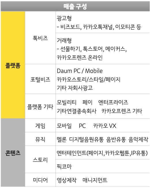 포털비즈 매출은 전 분기 대비 5%, 전년 동기 대비 2% 감소한 1,192억 원이다. 플랫폼 기타 부문 매출은 카카오페이의 결제, 금융 서비스 확대로 전 분기 대비 3%, 전년 동기 대비 54% 증가한 2,547억 원을 기록했다.