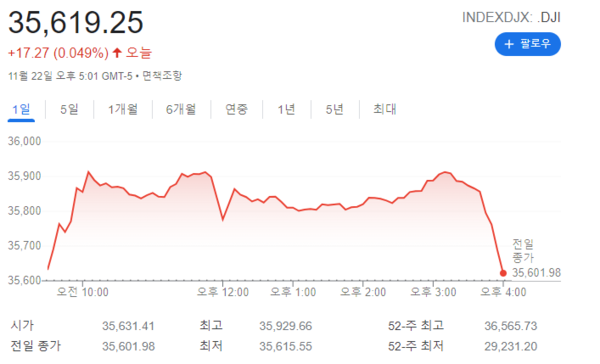 22일 현지시간 다우존스 30 산업평균지수는 전일대비 0.05% 상승한 35619.25으로 거래를 마감했다. 스탠더드앤드푸어스(S%P) 500 지수는 전일대비 0.32% 하락한 4682.94으로 마감하였으며, 기술주 중심의 나스닥 지수는 1.26% 하락한 15854.76으로 마감하였다