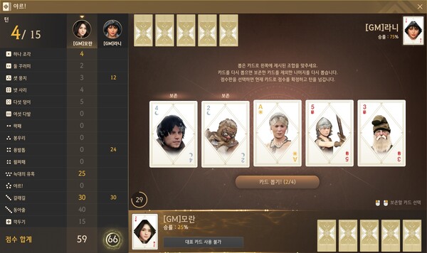 5장의 카드로 덱을 구성해 난이도에 따라 정해진 족보를 완성하고, 완성된 족보의 점수 합이 높은 이용자가 승리하는 방식이다. 카드를 뽑을 때 특유의 손맛, 원하는 족보를 완성해나가는 과정에 필요한 상대 이용자와의 전략 및 심리전의 쾌감을 느낄 수 있다.