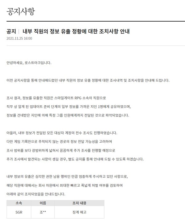 스마일게이트RPG는 25일 ‘로스트아크’ 공식 홈페이지를 통해 “내부 정보의 유출은 심각한 권한 남용 행위인만큼 엄중하게 주시하는 사항”이라며 “해당 직원에 대해서는 회사 차원에서 최대한 빠르고 폭넓게 처벌 여부를 검토해 해고 조치되었다”고 밝혔다.