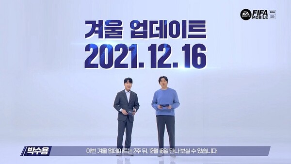 ‘2021 윈터 쇼케이스’는 이날 낮 12시부터 ‘피파 모바일’ 공식 유튜브 채널과 아프리카TV 채널에서 진행됐으며, 성승헌 캐스터와 넥슨 박수용 사업팀장, EA 차이나 스튜디오 제이스 양 게임 매니저(GM)가 등장해 겨울 업데이트를 소개했다. 업데이트는 오는 12월 16일 실시될 예정이다.
