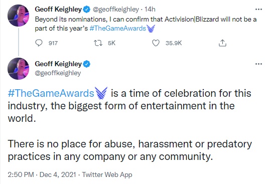 TGA의 주최자 제프 키글리(Geoff Keighley)는 4일 트위터를 통해 “액티비전 블리자드는 올해 TGA에서 수상 후보에 오르는 것 외에는 참가하지 않을 것”이라며 “TGA는 전 세계 게임업계를 축하하는 자리다. 학대, 괴롭힘, 약탈적 행위를 하는 기업이나 커뮤니티를 위한 자리는 없다”고 밝혔다.