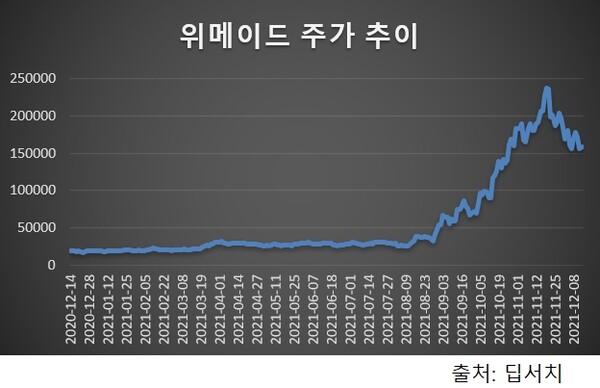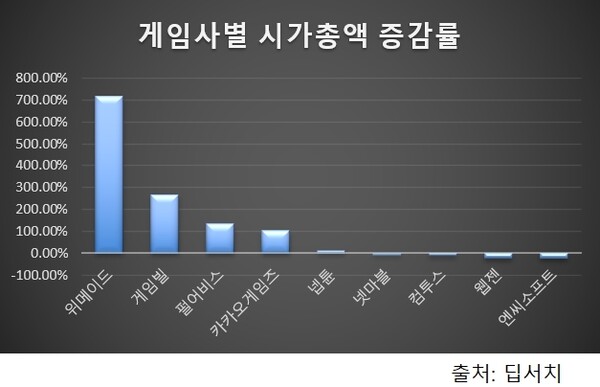 올해 게임업계를 둘러싼 이슈는 가히 시장 분위기를 완전히 바꿨다고 해도 과언이 아니다. 국내 증시에 상장된 게임사들의 올해 주가는 상승률 기준(2020년 말~현재) 위메이드가 717.6%로 1위를 차지했다. 이어 게임빌이 266.6%, 펄어비스 132.6%, 카카오게임즈 102.3% 순으로 나타났다.