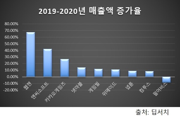 이는 2019~2020년 게임사 매출액 증가율과 비교했을 때 더욱 확실히 드러난다. 지난해 엔씨소프트 매출액은 2조4162억 원으로 직전년도대비 42.03% 증가했고 웹젠과 넷마블도 각각 67.08%, 14.05% 상승했다.