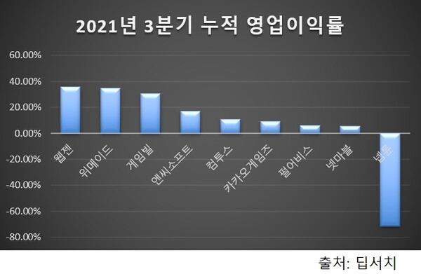 2020년 말 기준 국내 상장 게임사 중 가장 높은 영업이익률을 기록한 곳은 엔씨소프트(34.14%)다. 이어 웹젠(36.81%), 펄어비스(32.18%), 컴투스(22.42%), 게임빌(17.70%), 카카오게임즈(13.42%) 순으로 높다.