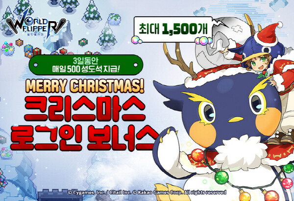 모바일 액션 RPG ‘월드 플리퍼’에서는 오는 24일부터 26일까지 게임에 접속한 이용자 전원에게 총 1,500개의 재화 ‘성도석’을 선물하는 ‘크리스마스 로그인 보너스’ 이벤트를 실시한다.