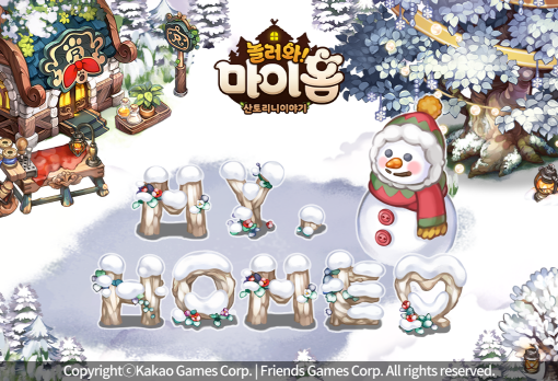 소셜 네트워크 게임(SNG) ‘놀러와 마이홈’에서는 1월 6일까지 재료를 모아 ‘로빈 작업대’에서 눈사람을 제작하고, ‘겨울 버전 알파벳’을 수확한 후 미션을 수행하는 이벤트를 진행한다. 또, 21일부터 튜토리얼을 완료한 이용자를 대상으로 크리스마스 퀘스트 수행 시 귀여운 ‘토찌’ 이모티콘을 지급한다.