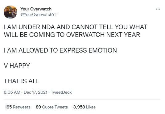 인기 유튜버 ‘Your Overwatch’는 “NDA를 작성했기 때문에 내년에 오버워치에 무엇이 나올지 말할 수는 없다”며 “오직 감정 표현만 허락받았다. 매우 기쁘다. 그게 전부”라고 전했다.