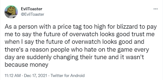 또다른 인기 유튜버 ‘EvilToaster’도 “난 블리자드에 매수당하기에는 너무 비싼 사람”이라며 “이런 내가 오버워치의 미래가 좋아보인다고 말하면 믿어도 된다. 매일 오버워치를 비판하던 사람들이 갑자기 입장을 바꾼데에는 이유가 있다. 돈 때문이 아니다”라고 강조했다.