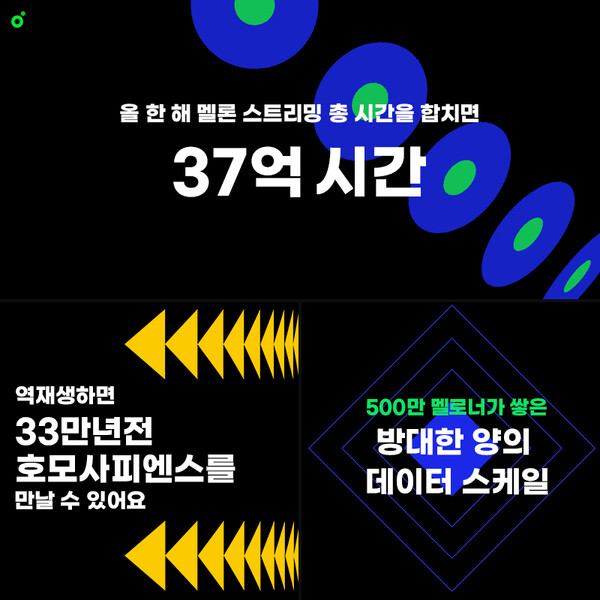 올 한 해 멜론 내에서 재생한 곡의 완곡 시간을 모두 합하면 총 37억시간에 달한다. 이를 현재부터 역재생하면 약 33만년전으로 현대인의 직계 조상으로 알려진 ‘호모 사피엔스(Homo sapiens)’가 활동했던 시절까지 거슬러 올라간다.