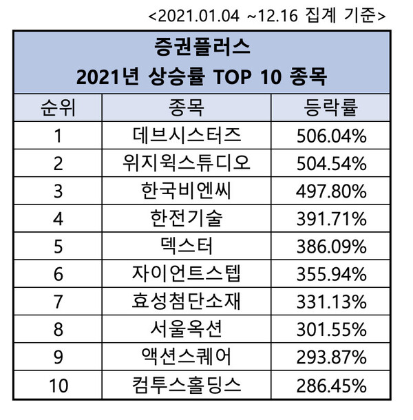 2021년 한 해 동안 증권플러스에서 가장 높은 상승률을 보인 종목은 506.04% 상승한 ‘데브시스터즈’다. 데브시스터즈는 올해 1월 출시한 ‘쿠키런:킹덤’의 국내 흥행으로 시장의 큰 관심을 받았다. 증권플러스가 꼽은 올 상반기 상승률 1위 종목에 오르기도 했다. 하반기에는 ‘쿠키런:킹덤’이 일본과 미국을 중심으로 해외 시장에서 주목을 받아 강세를 이어갔다.