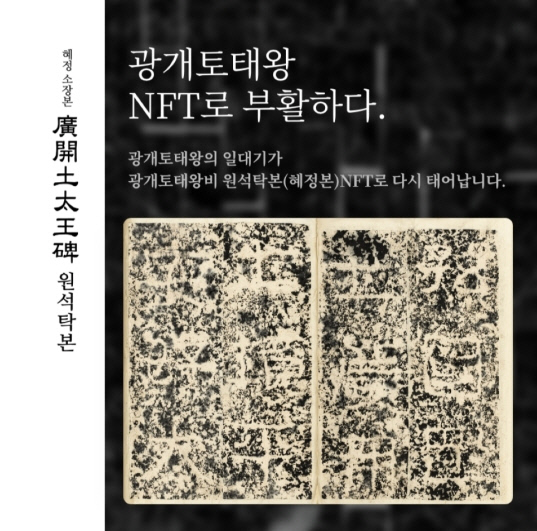 광개토태왕비 원석탁본(혜정본) NFT(NFT(대체불가토큰, Non-fungible Token)는 혜정문화재단의 김혜정 이사장이 소장한 실물 원석탁본이 대상물이다.