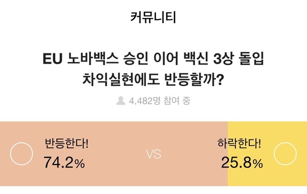 4482명이 참여한 “EU 노바백스 승인 이어 백신 3상 돌입…. 차익실현에도 SK바이오사이언스 주가 반등할까?” 설문에서 74.2%는 ‘반등한다’, 25.8%는 ‘하락한다’라고 답했다.