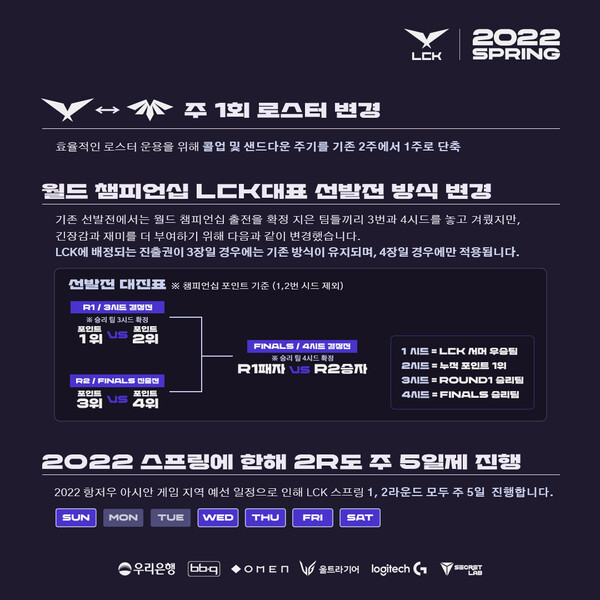 LCK는 이번 2022 스프링 시즌부터 다양한 변화를 적용한다. 먼저 콜업과 샌드다운 주기가 기존 2주에서 1주로 단축되어 각 팀들이 효율적인 로스터를 운용할 수 있게 된다. 또한 롤드컵(LoL 월드 챔피언십) 대표 선발전 방식이 시드권을 4장 받았을 경우 약간 변경된다. 월드 챔피언십 진출을 확정지은 1,2번 시드를 제외한 나머지 팀 중 챔피언십 포인트 1위와 2위가 대결을 펼쳐 승리한 팀이 3번 시드로 월드 챔피언십에 나설 자격을 확보한다. 이 경기에서 패한 팀은 3위와 4위의 대결에서 승리한 팀과 최종전을 치러 승리한 팀이 4번 시드를 획득한다. 마지막으로 2022 스프링 시즌에 한해 1라운드와 2라운드 모두 주5일제로 진행된다. 2022년 항저우 아시안게임 준비 때문이다.