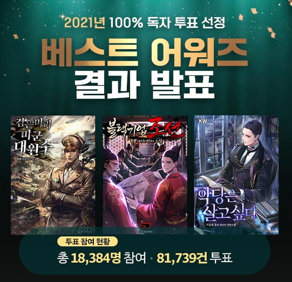 2021 베스트 어워즈는 독자들이 직접 지난 한 해 동안 인기를 끌었던 50개의 후보작 가운데 최고의 작품을 선정한 행사로, 회원 1만 8384명이 참여해 총 8만1739건의 투표가 이뤄졌다.