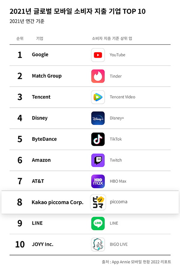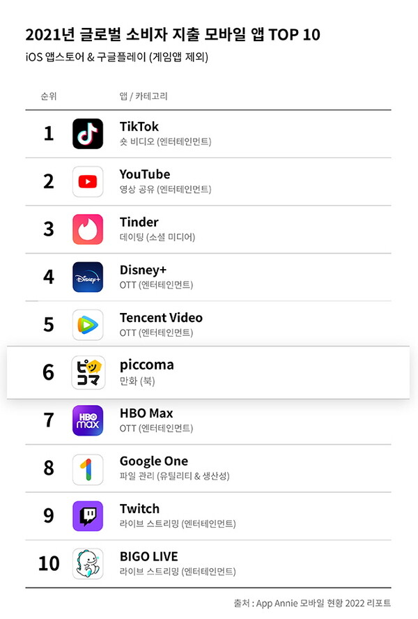 모바일 데이터 및 분석 플랫폼 앱애니(App Annie)가 최근 발표한 ‘2022년 모바일 현황 보고서’에 따르면 지난해 한 해 동안 글로벌 모바일 시장에서 소비자가 가장 많이 지갑을 연 앱 순위에서 픽코마는 6위를 차지했다.