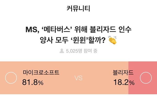 5025명이 참여한 “MS '메타버스' 위해 블리자드 인수... 양사 모두 윈윈할까?” 설문에서 81.8%는 ‘마이크로소프트’, 18.2%는 ‘블리자드’에 긍정적인 인수 결정이라고 답변했다.