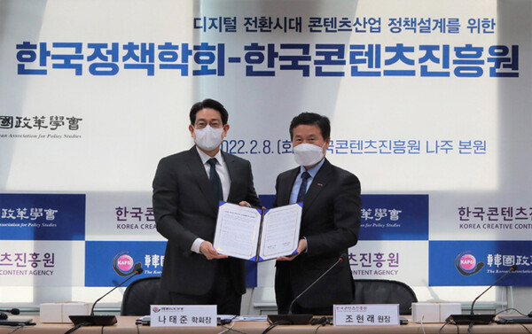 한국콘텐츠진흥원(원장 조현래)과 한국정책학회(학회장 나태준)는 8일 한국콘텐츠진흥원 나주 본원에서 ‘미래의 콘텐츠산업 정책방향 제시를 위한 업무협약’을 체결했다.