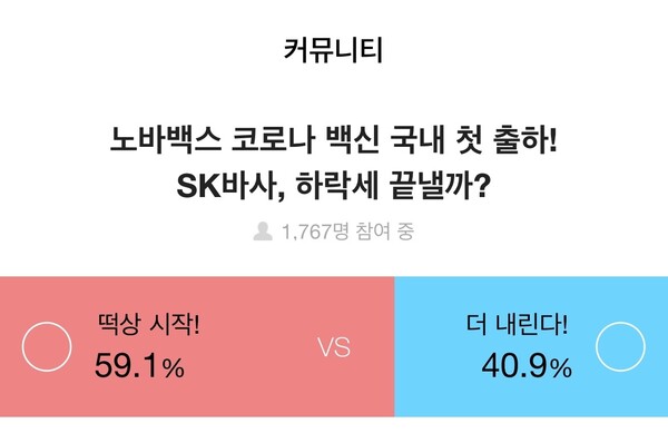 1767명이 참여한 “노바백스 코로나 백신 국내 첫 출하! SK바사, 하락세 끝낼까?” 설문조사에서 59.1%는 '상승 시작한다', 40.9%는 '더 하락한다'를 선택했다.