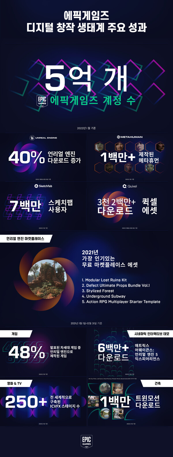 초고품질의 디지털 휴먼을 단 몇 분 만에 만들 수 있는 클라우드 기반 무료 앱인 메타휴먼 크리에이터는 작년 2월에 공개된 이래, 100만 명 이상의 메타휴먼을 만들어냈다. 또한 사용자가 웹에서 직접 3D 콘텐츠를 검색, 편집, 구매 및 판매할 수 있게 해주는 플랫폼인 스케치팹은 작년 7월 에픽게임즈에 합류한 후 총 회원수가 700만 명을 돌파했다. 수십만 개의 고퀄리티 에셋을 제공해 사용자들이 손쉽게 콘텐츠를 제작하도록 지원하는 언리얼 엔진 마켓플레이스와 퀵셀 브리지의 이용도 활발했다. 2021년 한 해 동안 언리얼 엔진 마켓플레이스 사용자는 전년 대비 50% 이상 증가했고, 퀵셀에서의 에셋 다운로드는 총 3,200만 회 이상을 기록했다.