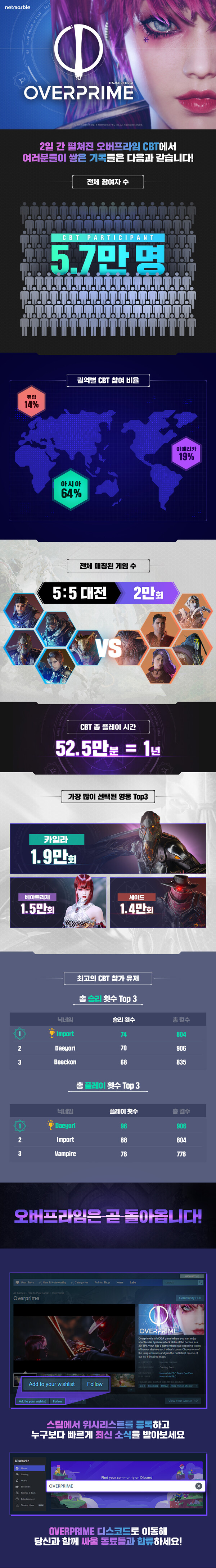 넷마블(대표 권영식, 도기욱)은 3D TPS 진지점령(MOBA) PC게임 ‘오버프라임’(개발사 넷마블에프앤씨) 비공개 시범 테스트(이하 CBT) 결과를 담은 인포그래픽을 공개했다고 21일 밝혔다.