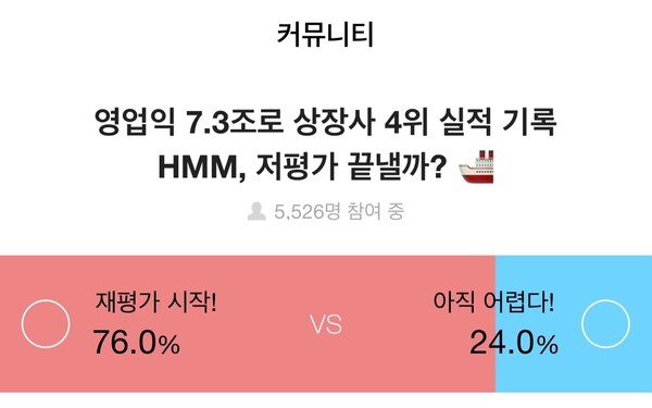 5526명이 참여한 “영업익 7.3조로 상장사 4위 실적 기록... HMM 저평가 끝낼까?” 설문에서 76%는 ‘재평가 시작’, 24%는 ‘아직 어렵다’고 대답했다.