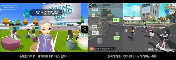 메타버스의 개념이 교육계에 등장한 것은 교육자체에 활용한다는 측면이 아닌 입학식이나 축제와 같은 행사를 가상공간에서 개최하는 측면이었다. 대표적으로 순천향대학교의 메타버스 입학식이나 건국대학교의 메타버스 축제를 들 수 있다.