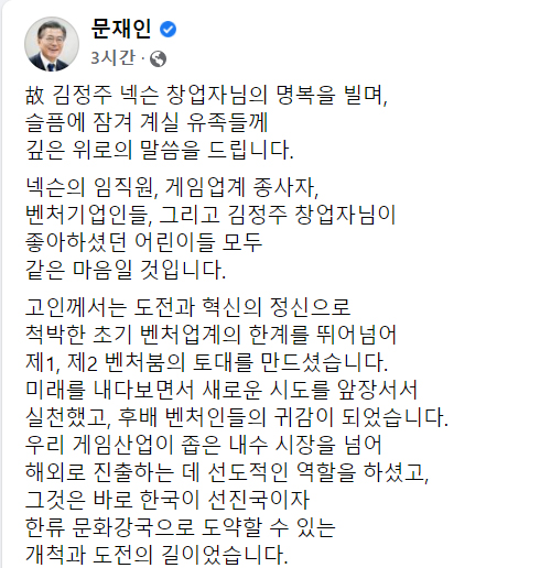 4일 문 대통령은 공식 SNS를 통해 “故 김정주 넥슨 창업자님의 명복을 빌며, 슬픔에 잠겨 계실 유족들께 깊은 위로의 말씀을 드린다”며 “넥슨의 임직원, 게임업계 종사자, 벤처기업인들, 그리고 김정주 창업자님이 좋아하셨던 어린이들 모두 같은 마음일 것”이라고 전했다.