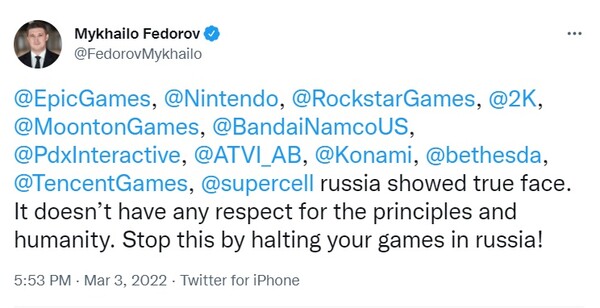 미하일로 페도로프 우크라이나 부총리가 글로벌 게임사들에게 “러시아에서 게임 서비스를 중단해달라”고 공식적으로 호소한 가운데, 이에 화답해 러시아 서비스 중단을 선언한 게임사들이 늘어나고 있다. 지금까지 액티비전 블리자드, 에픽게임즈, EA, 마이크로소프트 등이 동참했다.