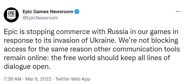 에픽게임즈도 “우크라이나 침공에 대한 대응으로 러시아와의 거래를 중단한다”고 밝혔다. 하지만 “자유주의 진영에서는 모든 대화의 통로를 열어두어야 한다”는 이유로 러시아 유저가 게임에 접속하는 것은 막지 않을 계획이다.