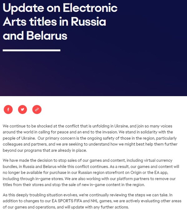 또한 “분쟁이 계속되는 동안 러시아와 벨로루시에서 게임 및 콘텐츠 판매를 중단하기로 결정했다”며 “러시아 지역의 EA 스토어에서 더 이상 게임과 콘텐츠를 구매할 수 없다. 또한 (러시아 현지) 플랫폼에서도 우리의 게임을 삭제하고, 새로운 게임 콘텐츠 판매를 중단한다”고 밝혔다.