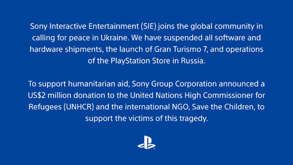 소니는 이날 “우크라이나의 평화를 촉구하는 세계적 흐름에 동참하기로 했다”며 “러시아를 상대로 플레이스테이션(PS) 관련 모든 소프트웨어, 하드웨어 출시 및 플레이스테이션 스토어 운영을 중단한다”고 밝혔다. 인기 레이싱 게임 타이틀 ‘그란투리스모 7’의 러시아 출시 역시 취소하기로 했다.