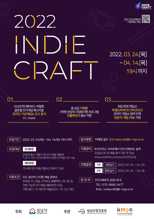 성남시가 주최하고 성남산업진흥원(원장 류해필)과 한국모바일게임협회(회장 황성익)이 공동주관하는 ‘2022 인디크래프트’는 2017년부터 추진해오고 있는 글로벌 인디게임 공모전이다.