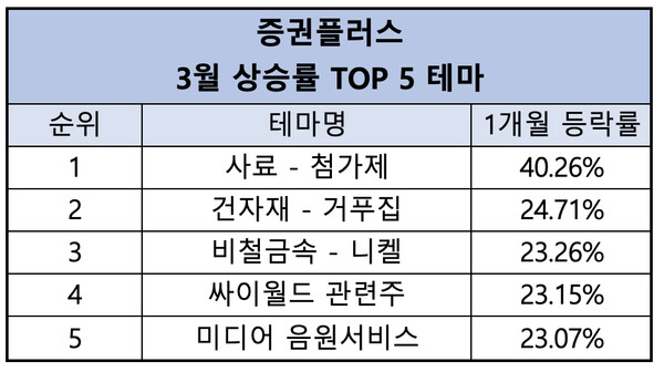2위는 24.71% 오른 ‘건자재-거푸집’ 테마가 차지했다. 거푸집은 건물 공사 시 콘크리트를 붓기 위해 사용되는 일종의 ‘틀’로, 건설에 있어 필수 불가결한 요소다. 최근 건설 경기 회복에 대한 기대감이 확대되면서 삼목에스폼, 윈하이텍, 덕신하우징 등이 주목받았다.