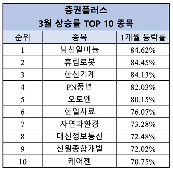 3월 한 달간 가장 높은 상승률을 보인 종목은 84.62% 상승한 ‘남선알미늄’이다. 남선알미늄은 알루미늄 산업의 종합 메이커다. 최근 계속되는 글로벌 공급망 불안으로 알루미늄 공급 차질 우려가 형성됐고, 호주의 러시아향 알루미나와 알루미늄 광석 수출 금지 발표가 이어졌다. 런던금속거래소(LME) 기준 알루미늄 현물 가격은 연초 톤당 2,815.5달러에서 3월 말까지 약 24% 오른 3,503.0달러에 거래되고 있는 것으로 나타났다.