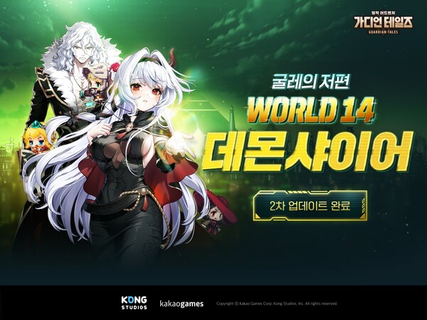카카오게임즈(대표 조계현)는 콩 스튜디오(대표 원)가 개발한 모바일 RPG ‘가디언 테일즈’에 신규 월드 14 ‘데몬샤이어 굴레의 저편’의 2차 업데이트를 진행했다고 11일 밝혔다.