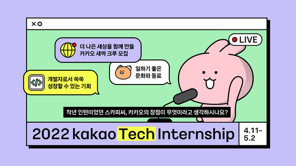 한편 카카오는 이번 인턴십 모집에 관심있는 예비 지원자를 위해 오는 16일 오후 1시부터 7시까지 ‘LIVE 설명회’를 진행한다.