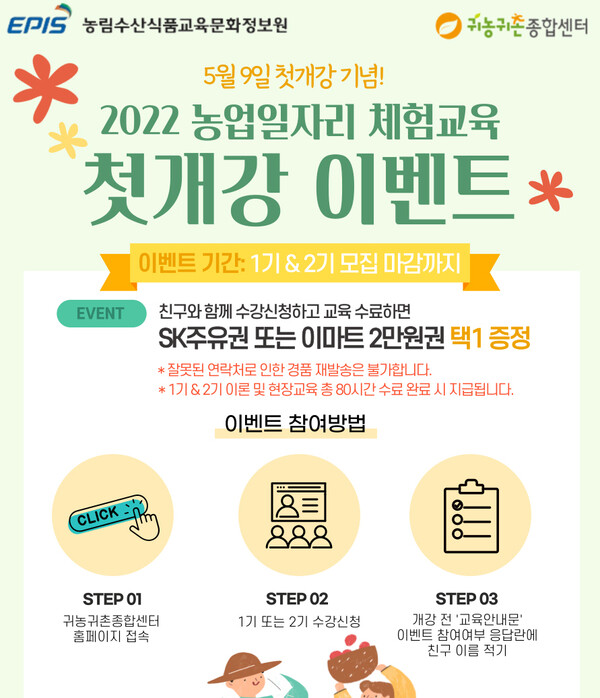 이경선 ㈜한국정책미디어 연구소장은 “일자리 체험을 하는 실습 농가는 대중교통 이용이 불편한 경우가 많다. 고유가 상황에 자차를 이용해 실습장을 왕복하는 수강생들에게 이동 주유비를 지원하고, 친구 또는 지인과 동반 수강을 통해 교육 수료에 대한 의지도 더 다질 수 있을 것”이라며 이벤트에 대한 기대를 전했다.