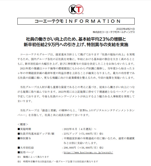 코에이테크모홀딩스는 21일 “2022년 6월부터 그룹 정규직을 대상으로 월급의 기본급 비율을 크게 높이고, 대졸 입사자의 초임을 대폭 인상한다”고 밝혔다. 기존 직원의 월급은 평균 7만3000엔(약 71만원) 인상하고, 대졸 신입사원 초임은 기존보다 5만6000엔(약 54만원) 인상한 29만엔(약 280만원)으로 책정했다. 이와 함께 특별 상여금도 지급할 계획이다.