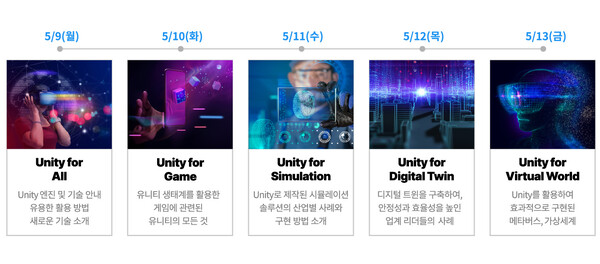 ▲유니티 ▲게임 ▲시뮬레이션 ▲디지털트윈 ▲가상·증강현실 총 5가지 주제를 중심으로 35여개의 세션을 선보인다. 모든 세션은 한국과학기술회관 지하 1층 오프라인 행사장과 온라인 채널을 통해 누구나 참여할 수 있다.