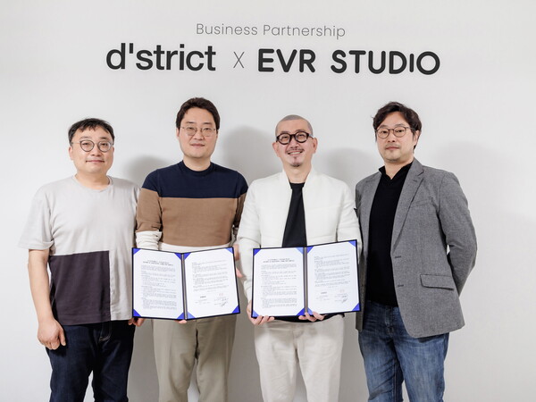 디지털 디자인 회사 ㈜디스트릭트홀딩스(대표 이성호, 이하 ‘디스트릭트’)와 디지털 콘텐츠 개발 회사 ㈜이브이알스튜디오(대표 김재환, 윤용기, 이하 ‘이브이알’)가 디지털 미디어아트 콘텐츠 사업 확대에 대한 업무 협력 및 공동 프로젝트 수행을 위해 업무 협약을 체결했다고 밝혔다.