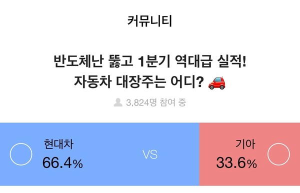 3,824명이 참여한 “반도체난 뚫고 1분기 역대급 실적! 자동차 대장주는 어디?” 설문에서 66.4%는 ‘현대자동차’, 33.6%는 ‘기아’를 선택했다.