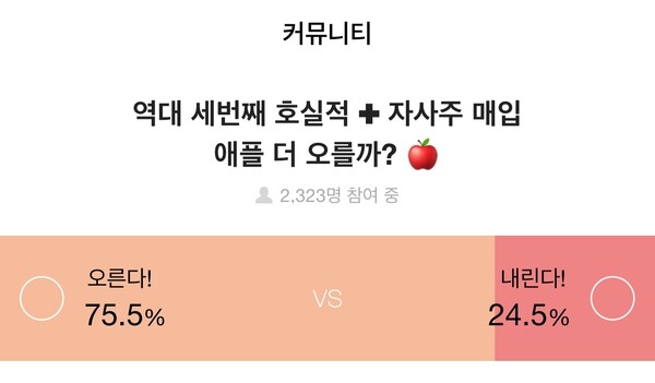 2,323명이 참여한 “역대 세 번째 호실적+자사주 매입... 애플 더 오를까?” 설문에서 75.5%는 ‘오른다’, 24.5%는 ‘내린다’고 답했다.