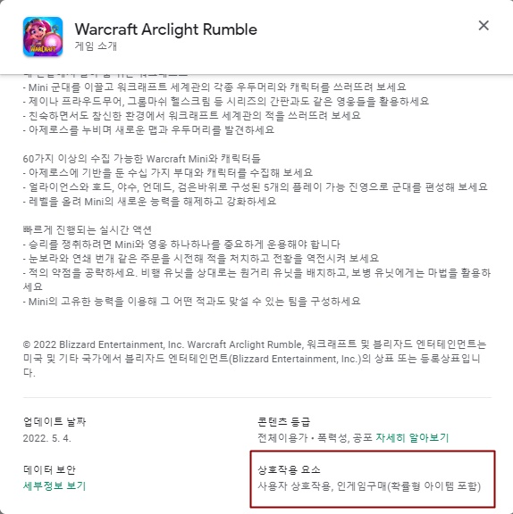 다만 이 부분은 ‘워크래프트 아크라이트 럼블’이 정식 출시될 때 변동될 가능성도 있다. 블리자드가 구글플레이에 게시한 게임 소개에는 상호작용 요소로 확률형 아이템을 포함한다는 문구가 있다.