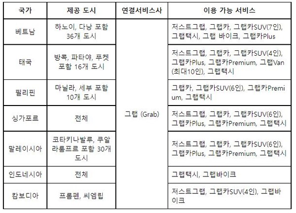 카카오모빌리티가 동남아 7개국으로 로밍 서비스를 확대 재오픈함에 따라 이용자들은 베트남, 싱가포르, 태국, 필리핀, 말레이시아, 인도네시아, 캄보디아 총 7개국에서 별도의 앱을 설치하거나 가입할 필요없이 카카오 T 앱으로 택시-그랩카-SUV-고급세단-오토바이 등 다양한 현지 모빌리티 서비스를 이용할 수 있다.