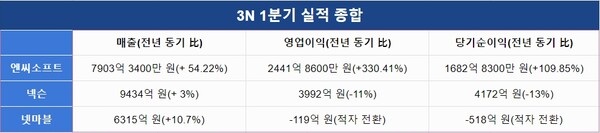 국내 게임업계를 대표하는 넥슨과 엔씨소프트, 넷마블, 이른바 3N의 실적 희비가 엇갈렸다.